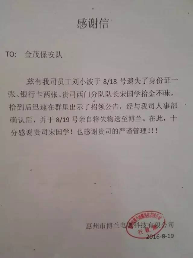 2016年8月18日,我公司駐龍溪電鍍基地金茂大隊西門分隊隊長宋國學當班巡邏時撿到1個身份證和2張銀行卡,在現場找尋不到失主的情況下,第一時間用對講機向大隊內勤報備,同時與客戶單位辦公室人事部積極聯系,核對確認身份證上顯示的人員信息。經確認,失物為客戶單位員工劉小波所有。次日,宋國學找到劉小波,核對、確認無誤后將失物親手交還,劉小波十分感激、再三感謝,表示如果身份證和銀行卡丟失肯定十分麻煩,幸虧宋國學幫他拾起妥善保管并親自交還。事后,客戶單位為我公司發來一封感謝信,表揚了宋國學撿金不昧的精神和嚴謹的工作態度。